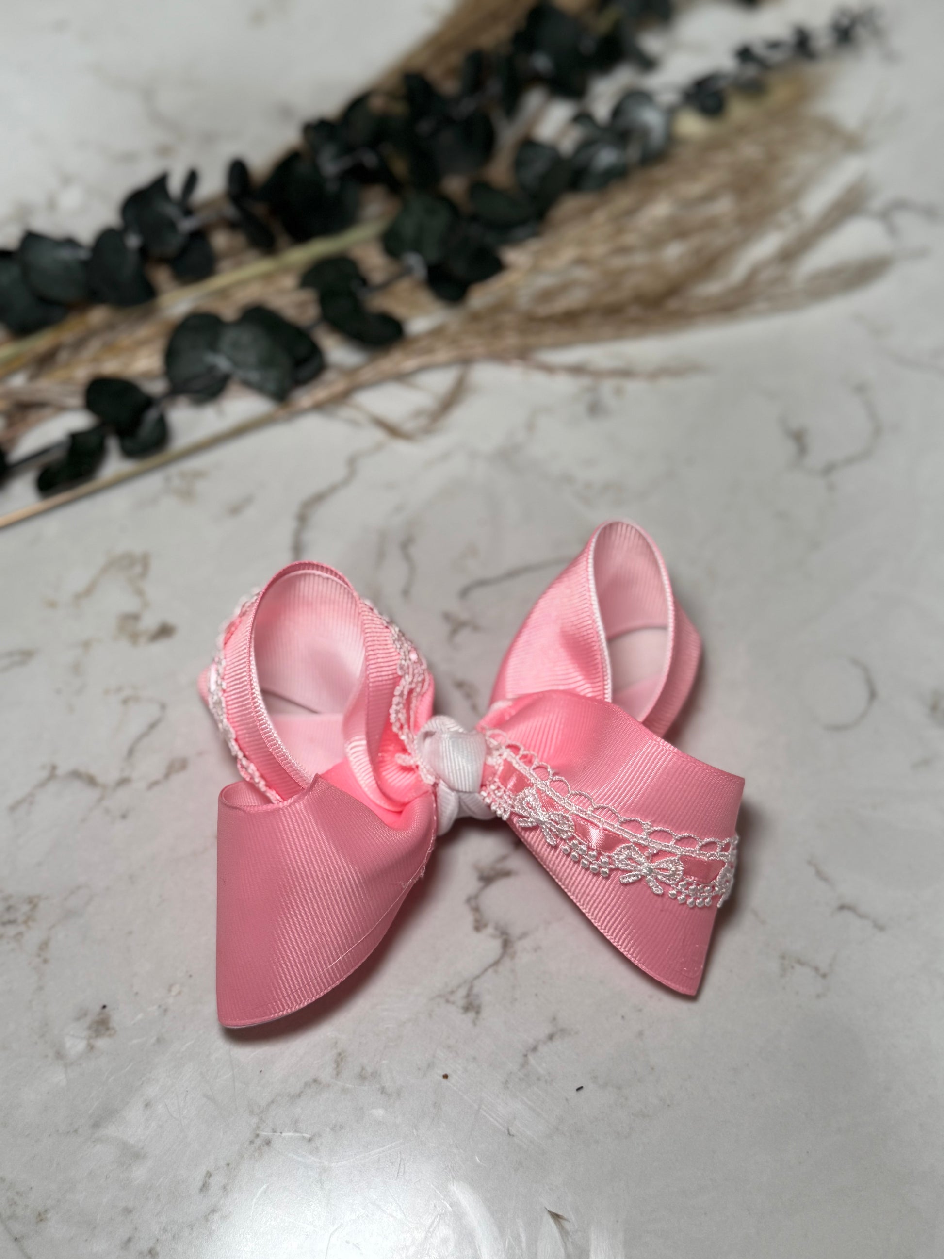 Our Pink Lace Bow with Lace combines girly colors and delicate details for the ultimate boutique-style accessory. This bow features layers of pink and white ribbon accented with lace, creating a textured, full design that’s as sweet as it is stylish.