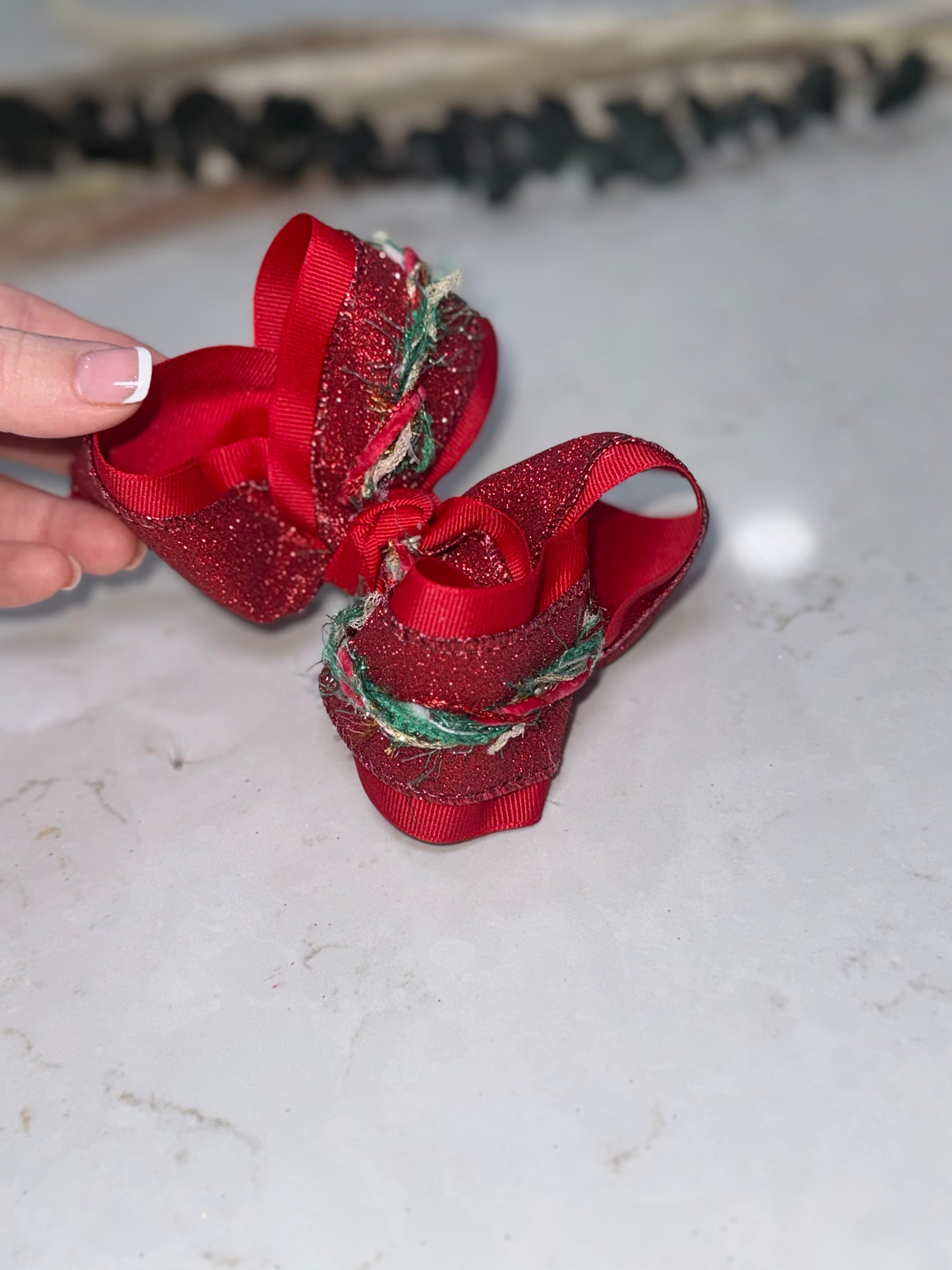A festive red bow layered with sparkling red glitter and wrapped with garland details on the loops. This bold and cheerful accessory is perfect for holiday season pictures and celebrations.